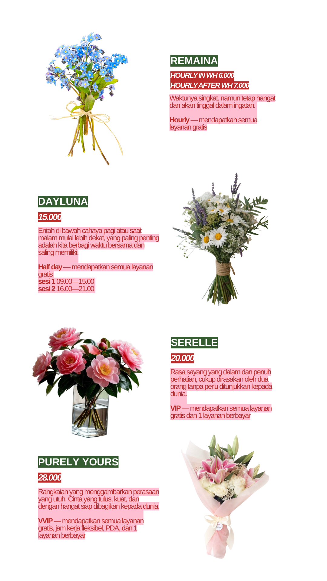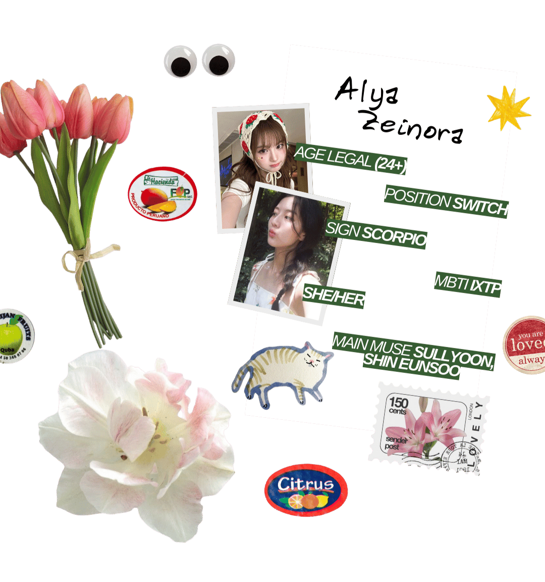 Sebelumnya aku mau ucapin selamat sudah menemukan toko bunga kecil di tengah ramainya dunia. Toko ini dibuat sederhana namun hangat dan menenangkan.Perkenalkan, namaku Alya Zeinora. Biasanya dipanggil Zei. Kamu bisa juga panggil aku pakai yang lain tapi dengan syarat harus lucu dan imut nama panggilannya. Zei cenderung pemalu tapi kalo udah nyaman bakal lebih bubbly dan malu-maluin (bercanda).Info penting. Zei kalo ke pacar bakal clingy dan kangenan banget. Dari sini kelihatan ya kalo #1 quality time dan physical touch. Gaya pacarannya sih lebih suka lovey-dovey, tapi jangan kaget kalo kadang Zei usilin dikit ya hehe. Soalnya Zei suka memancing amarah(lovingly) pacarku, biar dicubit pipinya, I'll take it as my reward for being cute.Waktu senggangnya Zei diisi dengan tidur, menonton, dan main roblox. Watchlist Zei ada dari drakor sampai film india pun asal ga horror pasti Zei tonton. Kalo roblox, Zei suka main di Violence District sebagai killer magang. Oh ya, Zei juga punya kucing yang ga kalah lucu dari Zei, nanti kalo ketemu Zei kenalin ya?Info yang penting ga penting, Zei ini DREAMZEN sejati. Hari-hari Zei diwarnai dengan lagu NCT DREAM. Selain mereka, Zei juga dengerin lagu dari artis lain, seperti NMIXX, aespa, LE SSERAFIM, ENHYPEN, Lany, Tulus, Nadin, Raissa Anggiani, dan masih banyak lagi. Asal lagunya enak pasti masuk playlist.